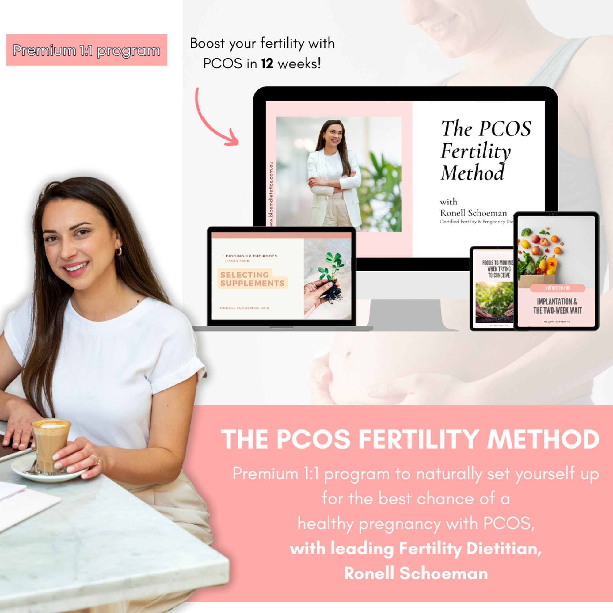 The most comprehensive 6-week online program to help you naturally boost your fertility with PCOS! Complete with over 25 video lessons, an abundance of resources to help you reach your goals, and access to The Ultimate PCOS & Fertility Recipe Hub, from leading Fertility & PCOS dietitian, Ronell Schoeman. Covering all the hot topics like supplements, supporting a regular cycle, targeting your hormones, & implantation!